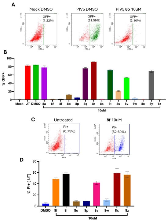 Comparison of cytotoxicity and anti-viral effect of chalcones 8a, 8f, 8l, 8o, 8p, and 8q–8z in a fibroblast cell culture. (A,B) Hs27 cells were treated with DMSO or with each chalcone at a concentration of 10 µM. After 24 h, cells were mock-infected or infected with PIV5-GFP at an MOI of 10 and cultured with chalcone-supplemented media at a concentration of 10 µM. At 24 hpi, cells were analyzed via flow cytometry for GFP expression. The loss of GFP expression with chalcone treatment is consistent with the inhibition of PIV5 replication. (A) Representative GFP flow cytometry scatter plots are shown. (C,D) Hs27 cells were treated with DMSO or with the indicated chalcone at a concentration of 10 μM for 24 h. After staining with propidium iodide (PI), cells were analyzed via flow cytometry. (C) Representative flow cytometry scatter plots for the control and 8f are shown. (D) The percentage of the cell population that was PI+ is shown for each chalcone.