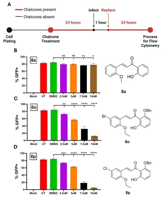 Chalcone treatment of Hs27 cells inhibits PIV5-GFP replication. (A) Schematic experimental design is shown for testing the effect of chalcones on infection and cell processing. Hs27 cells were treated with DMSO or treated with 8a (B), 8o (C), or 8p (D) at a concentration of 2.5, 5, 7.5, or 10 µM. After 24 h, cells were mock infected or infected with PIV5-GFP at an MOI of 10 and then cultured with chalcone-supplemented media at a concentration of 2.5, 5, 7.5, or 10 µM. At 24 hpi, the Hs27 cells were analyzed via flow cytometry for GFP expression. ns = not significant, * indicates a p-value < 0.05, ** indicates a p-value < 0.01, *** indicates a p-value < 0.001, and **** indicates a p-value < 0.0001.