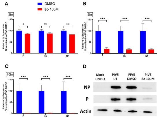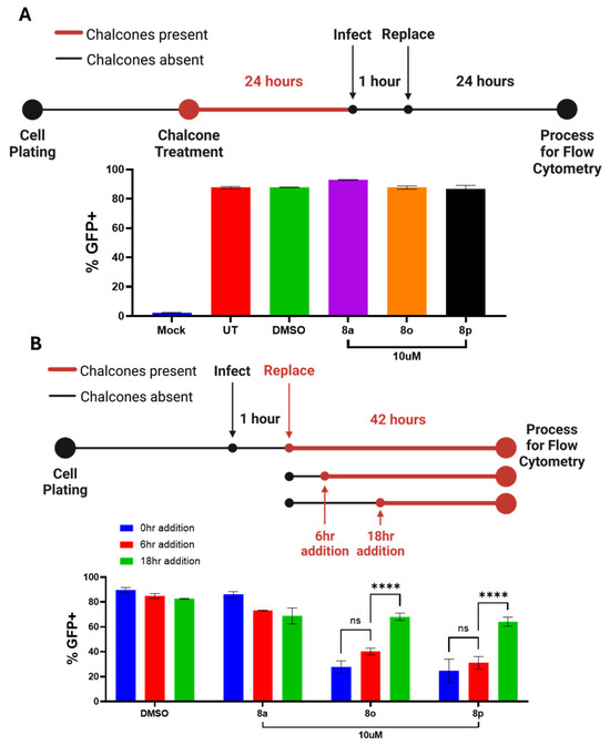 A time-of-addition experiment was then carried out to determine the time post-infection at which the chalcones inhibited viral protein expression. Hs27 cells were mock infected or infected with PIV5-GFP at a high MOI. Chalcones were then added at 10 μM to cell cultures at 0, 6, or 18 hpi. At 42 hpi, GFP expression was quantified using flow cytometry (see the design shown in Figure 6B). As shown in Figure 6B, ~80% of Hs27 cells were GFP-positive regardless of the time of addition in DMSO-treated controls or with treatment with the control chalcone 8a. The addition of chalcones 8o and 8p at 0 (or 6 hpi) significantly reduced the number of GFP-positive cells (to near 25%). By 18 hpi, the addition of chalcones 8o and 8p had no significant effect on the number of GFP-positive cells. These results indicate that the treatment of cells immediately following infection (i.e., 0–6 hpi) is sufficient to inhibit viral protein expression. However, this inhibition is diminished when chalcone addition occurs at later time points. Together, these data suggest the chalcones target an early stage of the viral replication cycle.