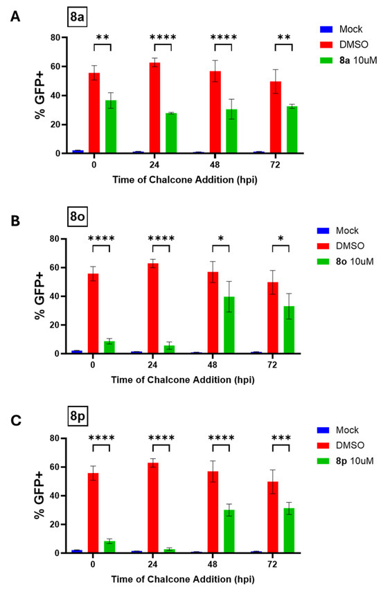 To determine how the time of addition of chalcones affected their ability to inhibit viral protein expression, Hs27 cells were treated with 10 μM of each chalcone overnight, mock infected or infected with PIV5-GFP at a high MOI, and then incubated in media lacking chalcone. At 24 hpi, cells were analyzed for GFP expression using flow cytometry (experimental design shown in Figure 6A). As shown in Figure 6A, ~80% of Hs27 cells were GFP-positive when left untreated or treated with DMSO. The pre-infection treatment of cells with 8a, 8o, and 8p resulted in no significant inhibition of GFP expression. These results demonstrated that when the chalcones were only present during the pre-infection period they were not effective at inhibiting the post-infection viral GFP expression in Hs27 cells.
