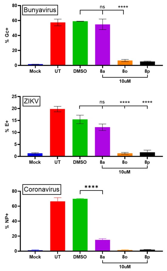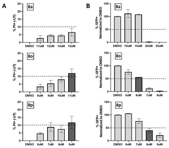 To determine the ability of 8a (control), 8o, and 8p to inhibit PIV5-GFP protein expression at various concentrations, Hs27 cells were left untreated, DMSO-treated as a control, or treated with each chalcone at 2.5, 5, 7.5, or 10 µM. At 24 hpt, cells were mock infected or infected with PIV-GFP at a high MOI; then, media were immediately replaced with chalcone-supplemented media. At 24 hpi, GFP-positive cells were quantified using flow cytometry (see experimental design shown in Figure 5A). As shown in Figure 5B, ~80% of PIV5-GFP-infected Hs27 cells were GFP-positive when left untreated or treated with DMSO as a control. There was a minimal effect of increasing the concentration of 8a on GFP expression, with GFP-positive cells remaining near 80%. In contrast, 8o (Figure 5C) and 8p (Figure 5D) showed a dose-dependent decrease in GFP expression with potent GFP expression inhibition seen at 10 μM (<10% GFP+). In combination with the minimal cytotoxic effects of 8o and 8p seen in Figure 4D, these results supported the further characterization of 8o and 8p as antivirals.