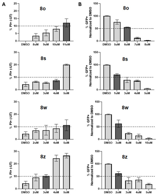To measure the effect of chalcone treatment on PIV5 virus growth, Hs27 cells were infected with PIV5-GFP. This engineered negative sense single-stranded RNA virus expresses GFP, which serves as a genome-encoded protein readout. After entering a cell, PIV5 must first undergo primary transcription to convert its genome into mRNA. As genome replication begins, nascent genomes then become templates for further conversion to mRNA and viral gene expression becomes amplified in a process called secondary transcription. For viral proteins to be detectable in cell culture, this amplification must first take place, making the expression of GFP a direct indicator of whether secondary transcription has successfully occurred [24]. Hs27 cells were treated with 10 μM of each chalcone for 24 h and then mock infected or infected at a high multiplicity of infection (MOI) with PIV5-GFP. Cells were then cultured in media supplemented with the same chalcone before being processed for flow cytometry at 24 h post-infection (hpi). As shown in the representative data in Figure 4A, ~82% of DMSO-treated PIV5-GFP infected cells were positive for GFP expression. This was reduced to ~2% GFP-positive cells after treatment with 8o. The ability of each chalcone to reduce viral GFP expression is shown in Figure 4B, with chalcones 8f, 8l, 8o, 8p, 8s, 8w, 8x, and 8z exhibiting the most notable performance against PIV5 infection. These chalcones were therefore selected for further screening for cytotoxicity.