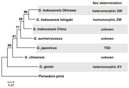 Maximum-likelihood trees were constructed using the Tamura-Nei model with a discrete Gamma distribution for a 658 bp alignment of COI gene sequences from six gecko species. In the phylogenetic tree, G. gecko was the first to diverge from the other Gekko species (Figure 1). Gekko auriverrucosus formed a sister group to the G. hokouensis clade. Within the G. hokouensis clade, the Chinese population diverged first from the two Japanese populations. This pattern of divergence appears to reflect the geographic relationships among the three populations. The two Japanese populations formed a monophyletic group, suggesting that they share a common ancestor. We were unable to infer the ancestral state of the sex determination system for the five Gekko species; however, at least two turnovers of the sex determination system have occurred during speciation of the five species.