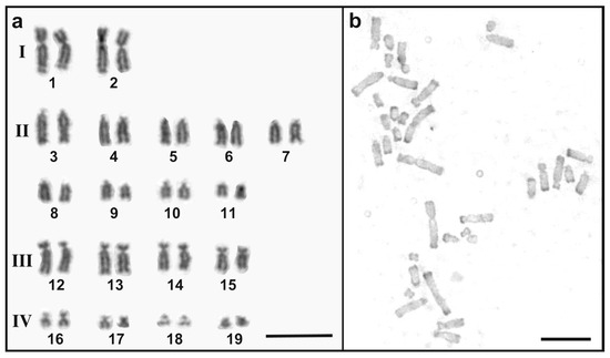 Karyotype and C-banded chromosomes of a G. hokouensis from Ishigaki population. (a) Giemsa-stained chromosomes of a metaphase of a female individual of G. hokouensis Ishigaki population were aligned according to a previous study [12]. Roman numerals show the grouping of chromosomes (see text). Arabic numerals show chromosome numbers. The fourth pair is the provisional ZW sex chromosome pair [12]. (b) C-banded metaphase spreads of the same individual. Scale bars indicate 10 µm.