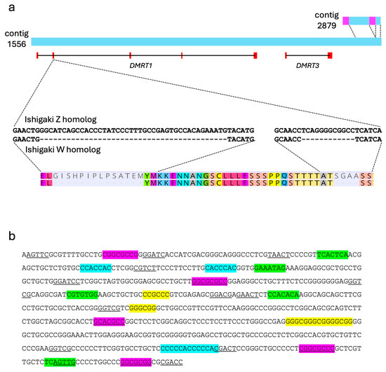 Five coding regions of Dmrt1 were predicted on contig 1556 using GeneWise. This gene structure, comprising five exons, is consistent with that of most vertebrate Dmrt1 homologs, where the start and stop codons are located in the first and fifth exons, respectively. The Dmrt1 spans from approximately position 2500 to 88,500 in contig 1556. Additionally, the other DM domain gene, DMRT3, was identified on the distal region of this contig (Figure 3a). Thus, contig 2879 shared sequence similarities with contig 1556 on the downstream region of DMRT3 (Figure 3a). Two unique regions were identified within contig 2879. We verified female-specificity of one of the two regions in Okinawa population using PCR (Supplementary File S1). Primer pairs were designed to span the boundaries between shared and unique regions—one targeting contig 1556 and the other the boundary region (Supplementary File S1). The amplicon from contig 1556 was detected in all individuals from both the Okinawa and Ishigaki populations. In contrast, the amplicon from the boundary region was detected only in females from the Okinawa population (Supplementary Figure S1b). These results suggest that contigs 1556 and 2879 correspond to genomic sequences from the Z and W chromosomes, respectively, of Okinawa population. Furthermore, the female-specific region of contig 2879 was not detected in genomic DNA from females of the Ishigaki population, indicating that this region may be unique to the Okinawa W chromosome.