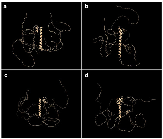 To investigate the functional differences between the Z and W Dmrt1 homologs in the Ishigaki population, we predicted their protein structures using AlphaFold2. As the Okinawa Z and W homologs share identical amino acid sequences with the Ishigaki Z homolog, they were excluded from this analysis. Human and leopard gecko homologs were included as references. In all four homologs, a single central α-helix was predicted (Figure 4a–d). This helix corresponds to the DM domain, which spans exons 1 and 2, and is thought to bind the major groove of target DNA sequences to activate transcription of downstream target genes. Although the Ishigaki W homolog lacks 18 amino acid residues in total, these deletions did not affect the formation of the α-helix. However, a notable structural difference was observed at the C-terminal end of the Ishigaki W homolog, which appears to fold over one side of the protein structure (Figure 4b). This arrangement was not observed for the human, leopard gecko and the Ishigaki Z homologs (Figure 4a,c,d).