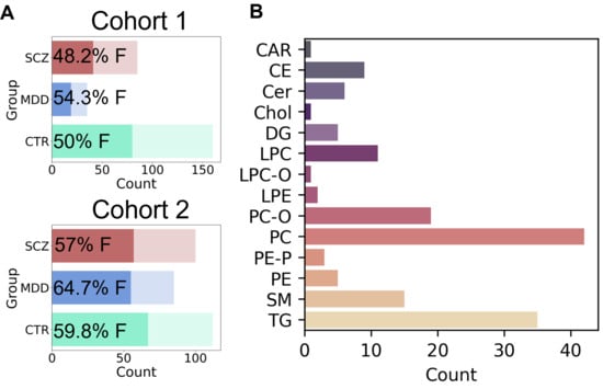 (A) The number of individuals in experimental groups: schizophrenia (SCZ), depression (MDD), and control (CTR) in Cohort 1 and Cohort 2. The percentage of females (F) is shown at each bar. (B) Count of detected lipid species distributed by classes: acylcarnitines (CAR), cholesterol esters (CE), ceramides (Cer), cholesterol (Chol), diacylglycerols (DG), lysophosphatidylcholines (LPC), ether LPC (LPC-O), lysophosphatidylethanolamines (LPE), phosphatidylcholines (PC), ether PC (PC-O), phosphatidylethanolamines (PE), plasmalogen PE (PE-P), sphingomyelins (SM), triacylglycerols (TG).