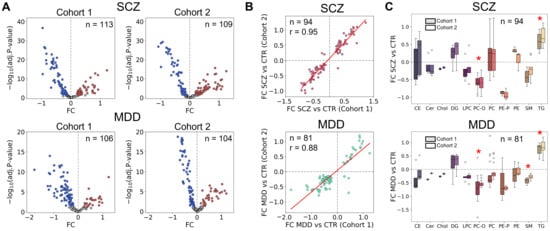 (A) Volcano plots for SCZ and MDD vs. CTR for Cohorts 1 and 2. Significantly altered lipids are red (for the increased ones) and blue (for the decreased ones), and n stands for the number of significantly altered lipids. The x-axis depicts the difference between each lipid log2-transformed intensity of SCZ or MDD and CTR (FC), and the y-axis depicts − log10 (adj. p-value) for t-test (lipid intensity of SCZ or MDD vs. CTR). (B) Correlations of log2-transformed FC in lipid abundances for SCZ or MDD against CTR between Cohort 1 and Cohort 2, where r stands for the Pearson correlation coefficient, and n stands for the number of intersected lipids. Red line depicts the linear regression line. (C) Boxplots showing the log2-transformed FC in lipid abundances for SCZ or MDD against CTR for the intersected lipids from both cohorts distributed by classes. Red asterisks above depict the pairs of boxplots where FC SCZ or MDD vs. CTR of lipids within a class showed a significant difference from 0 (one-sample Wilcoxon test, adj. p < 0.05).