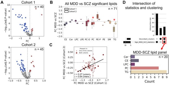 (A) Volcano plots for MDD vs. SCZ for Cohorts 1 and 2. Significantly altered lipids are red (for the increased ones) and blue (for the decreased ones); n stands for the number of significantly altered lipids; x-axis depicts the difference between each lipid log2-transformed intensity of MDD and SCZ (fold change, FC); and y-axis depicts −log10 (adj. p-value) for t-test (lipid intensity of MDD vs. SCZ). (B) Boxplots showing the log2-transformed FC in lipid abundances for MDD against SCZ of all the statistically significant lipids from both cohorts distributed by classes. Red asterisks above depict the pairs of boxplots where FC MDD vs. SCZ of lipids within a class showed a significant difference from 0 (one-sample Wilcoxon test, adj. p < 0.05). (C) Correlations of log2-transformed FC in lipid abundances for MDD against SCZ between Cohort 1 and Cohort 2. The lipids found to be significant in only one of the cohorts are depicted in light red color, while the intersection of significant lipids is shown in dark red points; r stands for the Pearson correlation coefficients (“union” for the all significant lipids in both cohorts (n = 71); and “inters.” for the intersection of significant lipids (n =14)). Black line depicts the linear regression line. (D) UpSet plot for statistically significant lipids between MDD and SCZ (“Sign_MDD_SCZ_statistics”) and those belonging to “discordant” clusters (“Discordant_clusters”). The intersection is shown in the red square (MDD-SCZ lipid panel). The bottom count plot shows the distribution of this panel by lipid classes.
