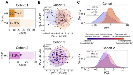 (A) The number of individuals in the experimental groups: schizoaffective (AFF) and schizotypal (TYP) in Cohort 1 and bipolar (BPD) in Cohort 2. The percentage of females (F) is shown on each bar. (B) Illustration of principal component analysis (PCA) for the species included in MDD-SCZ lipid panel performed on both cohorts together. Points corresponding to the different diseases are outlined in colored ellipses. The borders of the ellipses depict the area inside which the points of that group are found with 95% confidence. On the x-axis, the first principal component (PC1) is plotted, while on the y-axis, the second principal component (PC2) is plotted with the percentage of variation explained by this component in the brackets. (C) Kernel density estimation (KDE) of the first components (PC1) of PCA analysis in each cohort. The scale in the middle with symptom gradient is the modified scale of psychotic and affective disorders taken from [38]. C1 in the legends at (B,C) stands for “Cohort 1”, and C2 stands for “Cohort 2”.