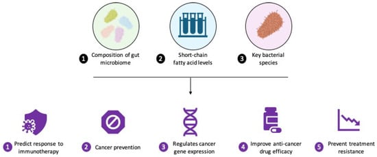 A growing understanding of how microbial species and their metabolites influence immune responses is opening new avenues for innovative cancer therapies. The interplay between the gut microbiome and the immune system is now recognized as a key driver of systemic immune regulation, offering opportunities to refine cancer immunotherapy strategies [208]. Recent research highlights the gut microbiome’s ability to enhance treatment efficacy; interventions such as probiotics and FMT have shown promise in increasing the diversity and abundance of beneficial gut bacteria. These approaches have been linked to improved treatment responses and reduced toxicity in cancer patients [209,210].