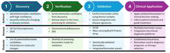 Stages of Biomarker Development: From Discovery to Clinical Application. The process begins with Discovery, where high-confidence biomarker candidates are identified using advanced detection technologies, followed by Verification, which screens and prioritizes potential biomarkers for further investigation. In the Validation phase, biomarkers are rigorously tested using diverse and representative patient cohorts to ensure reliability and predictive power. Finally, biomarkers transition to Clinical Application, where they guide patient selection, inform treatment strategies, and improve clinical outcomes. Each stage highlights specific technologies, such as ELISA, SERS, and electrochemical biosensors, alongside key challenges, including specificity, sensitivity, and reproducibility, emphasizing the iterative and multidisciplinary nature of biomarker development.