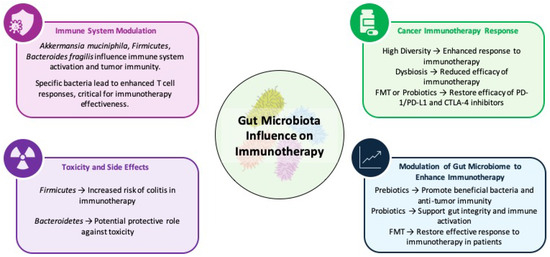 A diverse gut microbiome enriched with beneficial bacteria, such as Ruminococcaceae and Faecalibacterium, is associated with improved responses to immune checkpoint inhibitors (ICIs). In contrast, reduced microbial diversity and an overabundance of harmful bacteria, such as Bacteroidales, are associated with the diminished efficacy of immunotherapies. Antibiotic-induced dysbiosis further disrupts microbial balance and reduces the effectiveness of ICI, highlighting the importance of maintaining a healthy microbiome during cancer treatment [5,178,179,180,181,182,183,184,185].