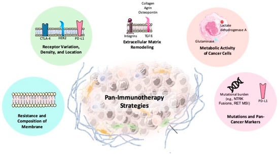The pan-cancer approach addresses these challenges by targeting shared molecular and genetic traits across different cancers, aiming to develop therapies with broader applicability (Figure 4 and Figure 5). Instead of focusing on individual cancer types, this strategy identifies common features, such as altered receptor expression (e.g., PD-L1, CTLA-4), metabolic changes (including glutaminase activity), extracellular matrix remodeling (collagen or hyaluronan), and variations in membrane lipid composition. Recent studies from our group have established agrin as a critical ECM biomarker in lung cancer, with implications for prognosis and therapeutic response [91,257,258,259,260,261,262,263,264,265].