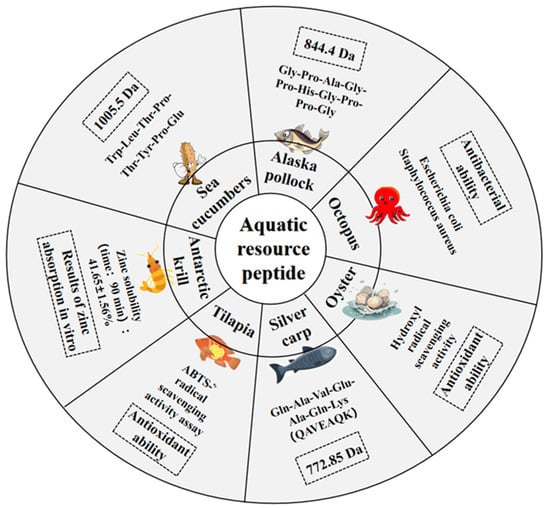 Aquatic organisms, contributing to approximately half of global biodiversity, contain a rich array of structurally diverse bioactive compounds with a wide range of biological activities [48]. Protein-rich aquatic organisms are valuable sources of bioactive peptides for food applications. Furthermore, various bioactive peptides have been extracted from by-products of aquatic product processing, which are commonly discarded or repurposed as animal feed or fertilizer [49]. These peptides demonstrate promising biological functionalities and have led to various proposals for functional food applications [48]. Over the past decade, a variety of zinc-chelating peptides have been identified in aquatic products and their by-products, highlighting their potential significance.