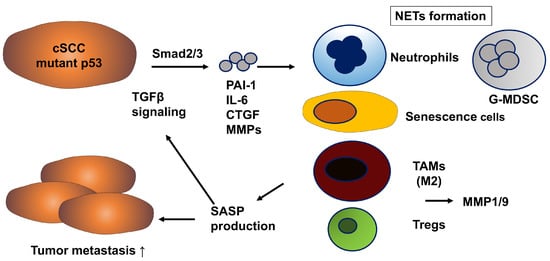 In cSCC, PAI-1 expression is markedly elevated compared to basal cell carcinoma and actinic keratosis, and has long been implicated in tumor invasion and metastasis [29]. Upregulation of PAI-1 is considered an early event in SCC progression and is localized in tumor cells and myofibroblasts at the invasive front of cSCC lesions [30]. In cSCC, mutant p53 (mutp53) promotes tumor progression by enhancing Smad2/3 transcriptional activity, thereby inducing the expression of TGF-β1-responsive genes such as PAI-1, connective tissue growth factor (CTGF), and IL-6 [31]. Indeed, mutp53 expression correlates with PAI-1 overexpression in clinical cSCC samples [31]. Furthermore, analysis of public databases reveals that mutp53, activation of the TGF-β signaling pathway, and high PAI-1 expression are associated with higher tumor malignancy and poor prognosis [31]. Notably, many TGF-β1-responsive genes including PAI-1, IL-6, CTGF, and matrix metalloproteinases (MMPs) are components of the senescence-associated secretory phenotype (SASP), which reprograms the behavior of stromal cells in the TME [32,33]. For example, PAI-1 activates the p53/p21 pathway, promotes cellular senescence via SASP induction, and senescent cells secrete SASP factors such as IL-6 and MMPs that recruit M2-type TAMs and regulatory T cells (Tregs), thereby establishing an immunosuppressive TME and ultimately accelerating tumor progression [34,35] (Figure 2). Interestingly, cSCC arising from hidradenitis suppurativa (HS), a neutrophilic autoinflammatory skin disease, has a significantly worse prognosis than cSCC induced by sun exposure [36]. This may be due to the involvement of multiple SASP factors such as IL-17 and IL-1 families [36]. Among these, IL-8—known as a SASP component—has recently attracted attention not only for its conventional role in neutrophil recruitment, but also for its central role in cancer malignancy by promoting metastasis and treatment resistance through the formation of an inflammatory TME [37]. Notably, tumor-derived IL-8 has been shown to induce the formation of neutrophil extracellular traps by granulocytic myeloid-derived suppressor cells, thereby contributing to immunosuppression and metastasis [38].