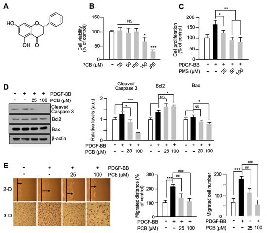 PCB inhibits PDGF-BB-induced VSMC proliferation and migration. (A) Chemical structure of PCB. (B) Cytotoxicity of PCB was evaluated using the MTT assay. Serum-starved VSMCs were treated with PCB (25~200 μM) for 24 h. (C) The effects of PCB on VSMC proliferation were evaluated using the BrdU incorporation assay. Serum-starved VSMCs were treated with PCB (25~100 μM) for 6 h and then incubated with PDGF-BB (25 ng/mL) for 24 h. (D) The effects of PCB on Bcl-2/Bax proteins in VSMCs. The Bcl-2/Bax ratio was calculated from the Bax and Bcl-2 over β-actin ratios. (E) Effects of PCB on VSMC migration were measured using a wound healing assay and 3D Boyden chamber assay. VSMCs were wounded (black lines) and treated with PDGF-BB or PCB. After 24 h, the migrated cells were measured using the ImageJ Software 1.54p. The black arrow represents the distance of the most migrated cells. The bottom shows the number of migrated cells. Representative images are shown from at least five independent experiments, taken at the time of 8 h after seeding. Mean ± SD (n = 5). * p < 0.05, ** p < 0.01, and *** p < 0.001 PCB versus PDGF-BB alone (B–D); *** p < 0.001 PDGF-BB versus control and ## p < 0.01, ### p < 0.001 PCB versus PDGF-BB alone (E); NS, no significance.