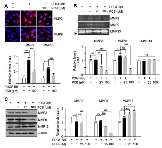 MMPs are involved in the migration or invasion process of various cell types, including VSMCs or cancer cells, and it has been reported that the expression of MMP2 and MMP9 in the extracellular matrix of blood vessels promotes the migration of VSMCs []. Therefore, to observe the changes in MMPs activities in PDGF-BB/PCB-treated VSMCs, immunofluorescence staining was performed. As seen in Figure 2A, the expression rates of MMP2 and MMP9 within VSMCs treated with PDGF-BB significantly increased compared to the control group, while they significantly decreased in cells treated with PCB. In addition, as a result of performing zymographic analysis with the culture medium of PDGF-BB/PCB-treated VSMCs, the zymolytic activities of MMP2 and MMP9 were significantly increased in the cells treated with PDGF-BB, and a concentration-dependent significant decrease was confirmed by PCB treatment (Figure 2B). However, no changes were observed in the level of MMP13 compared to the control group. Similar changes were also observed in the results of Western blot analysis (Figure 2C, see also Supplementary Materials). These results suggest that the expression levels of MMP2 and MMP9 increased by PDGF-BB in VSMCs are inhibited by PCB, thereby inhibiting the migration of VSMCs.