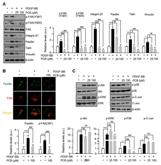 PCB attenuates PDGF-BB-induced the FAK-related and p38 signaling pathways. (A) Effects of PCB on the expression of FAK-related proteins in VSMCs. Serum-starved VSMCs were incubated with PCB (25~100 μM) for 2 h followed by 25 ng/mL of PDGF-BB treatment for 24 h. Protein levels were normalized to β-actin signals with the exception of p-FAK (Y397, Y925), which were normalized to their total FAK levels. (B) Extracellular levels of FAK-related proteins (Paxillin, green; FAK, red) were measured by confocal microscopy. (C) Effects of PCB on the expression of MAPK. Serum-starved VSMCs were incubated with PCB (25~100 μM) for 2 h followed by 25 ng/mL of PDGF-BB treatment for 30 min. The band densities phosphorylated proteins were normalized to those of total protein expression. Representative images are shown from at least three independent experiments. Mean ± SD (n = 4). * p < 0.05, ** p < 0.01, and *** p < 0.001 PDGF-BB versus control; # p < 0.05, ## p < 0.01, and ### p < 0.001 PCB versus PDGF-BB alone; NS, no significance.