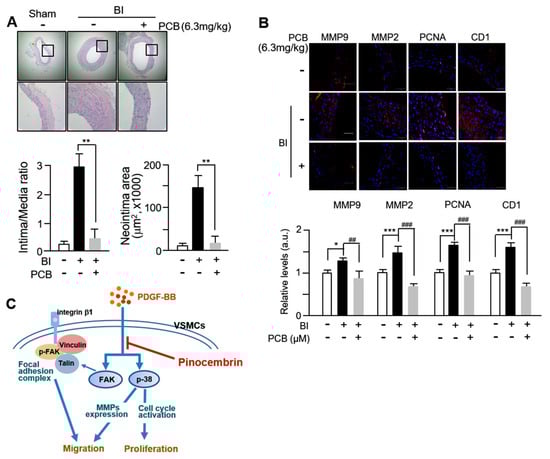 Next, we evaluated the effects of PCB administration on neointimal formation in the balloon-injured (BI) model of rat carotid arteries. PCB was administered to the BI arteries of rat via intraperitoneal injection. Analysis of H&E staining from Figure 5A revealed robust neointimal formation characterized by thick concentric layers post-BI (balloon injury), compared to the control group (sham-operated animals). However, in the BI animal model group treated with PCB, a significant reduction in neointimal formation and intima/media ratio to 85–87% was observed. Subsequent immunohistochemical staining revealed an significantly increased number of MMP2-, MMP-9-, PCNA-, and Cyclin D1-positive cells in BI vessels compared to the sham group, wereas BI vessels treated with PCB showed a marked decrease in these positively satained cells (Figure 5B). These findings suggest that the protective effect of PCB on neointimal formation occurs predominantly through regulation of MMP2, 9, PCNA, and Cyclin D1 expression in VSMCs. In this study, firstly, we confirmed that PCB inhibits proliferation and migration of VSMCs through decreased expression of cell cycle regulatory proteins and MMP2, MMP9. Secondly, we found that the target signaling of PCB regulating the proliferation and migration of VSMCs occurs through FAK and p38. These results are illustrated schematically in Figure 5C.