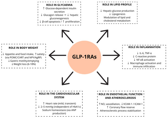 The pleiotropic presence of these receptors also contribute to several other mechanisms of actions initially less well-defined but also remarkably important. These effects involve mechanisms related to microcirculation, endothelial function, systemic inflammation and cardiovascular function, among others [13]. A detailed description of the main functional characteristics of these analogues is provided below as well as in Figure 1: