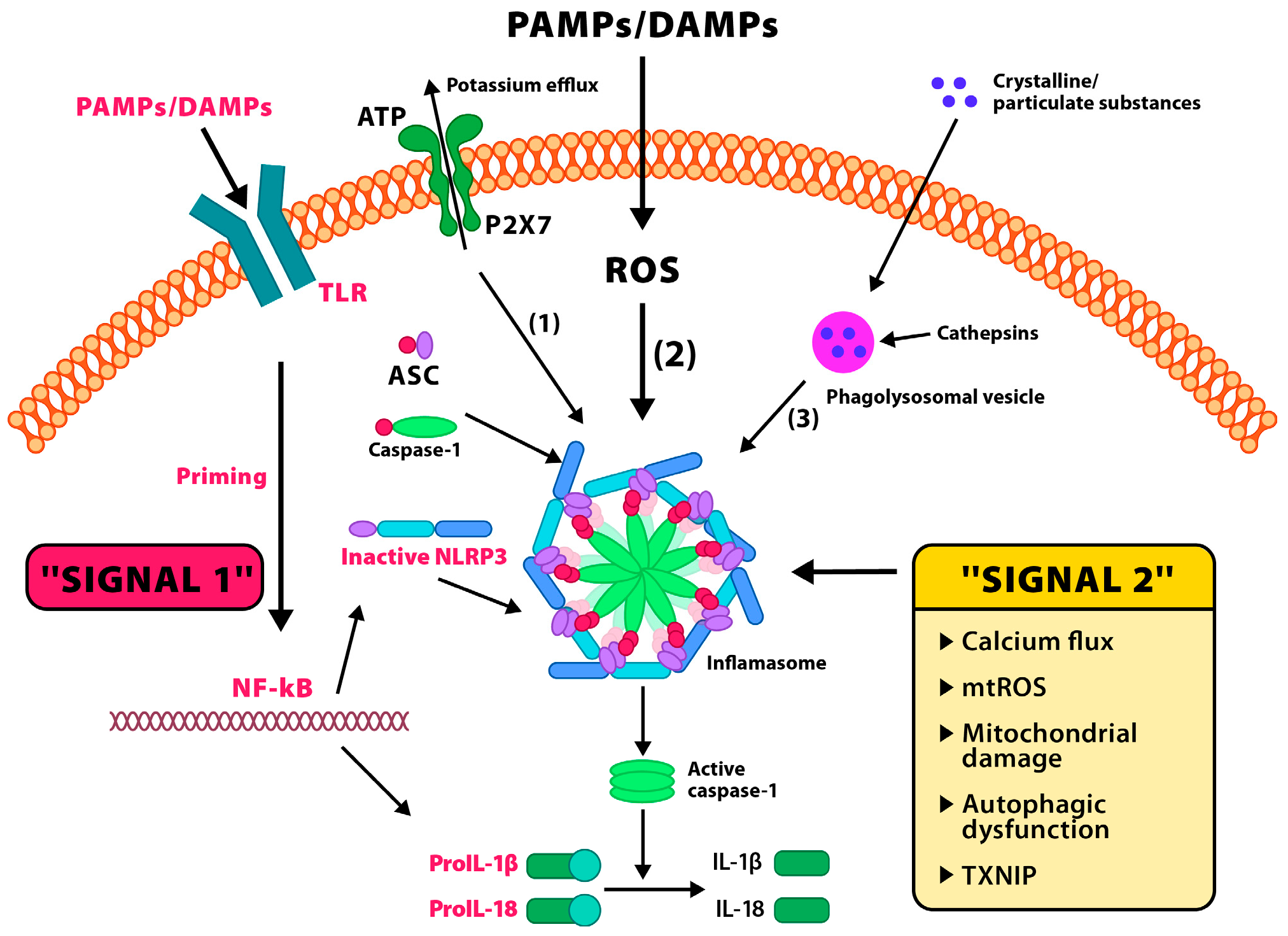 - Jo, E.K.; Kim, J.K.; Shin, D.M.; Sasakawa, C. Molecular mechanisms regulating NLRP3 inflammasome activation. Cell. Mol. Immunol. 2016, 13, 148–159. [Google Scholar] [CrossRef]