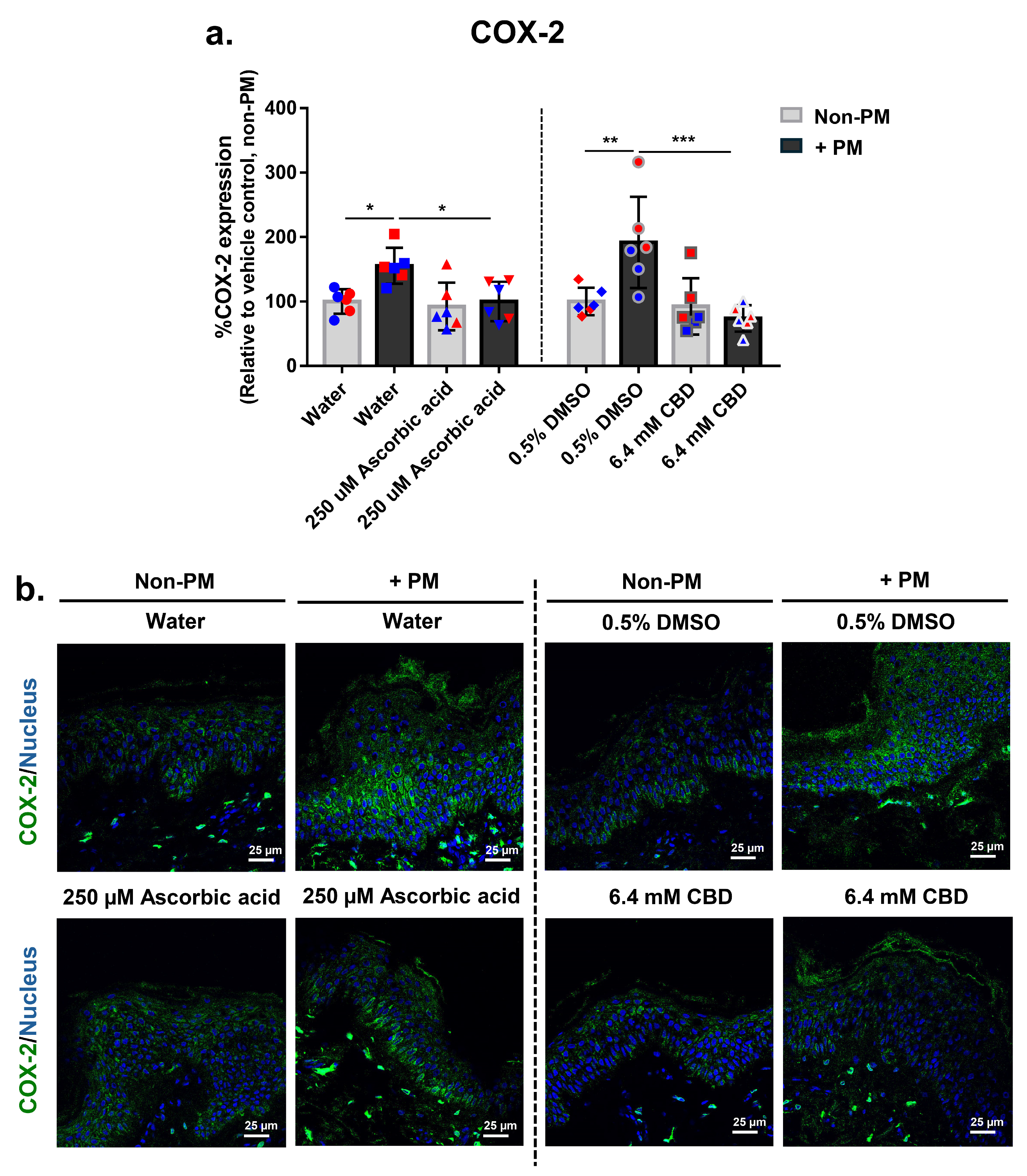3.4. CBD Attenuates PM-Induced COX-2 Expression in Human Skin Explants