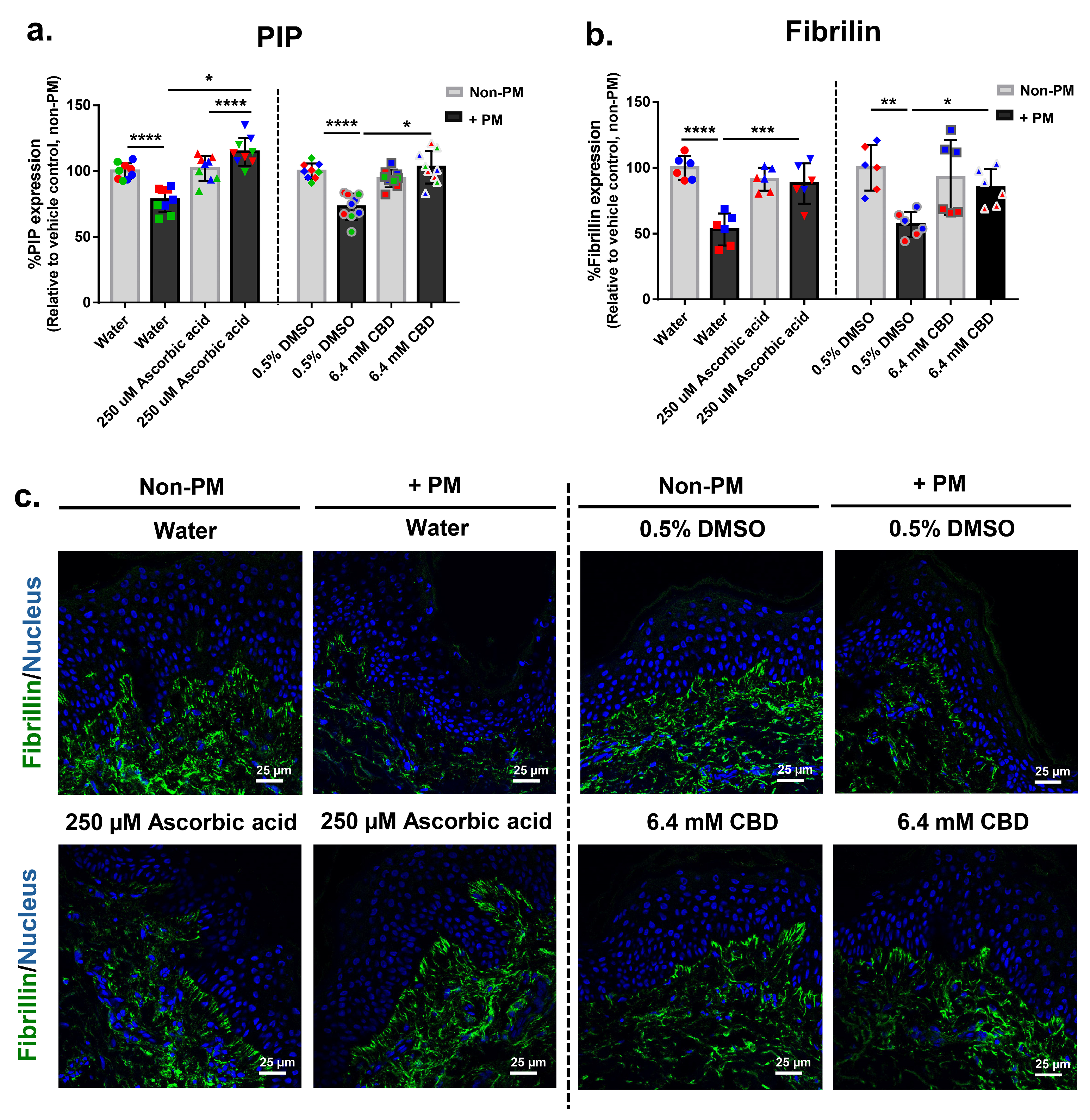 3.7. CBD Restores PM-Induced Decline in Extracellular Matrix Markers PIP and Fibrillin in Human Skin Explants