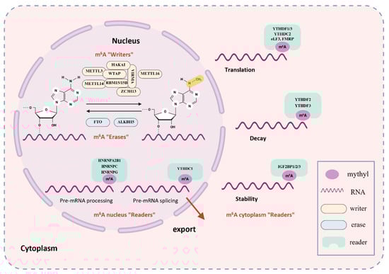 The m6A modification is predominantly found within a conserved consensus sequence, RRACH (where R = G or A; H = A, C, or U), and is enriched near stop codons and in 3′ untranslated region (3′-UTR) of mRNA transcripts [18]. Its biological functions are mediated by a sophisticated molecular network comprising three key classes of proteins: “writers,” “erasers,” and “readers.” These three components work synergistically to dynamically regulate m6A modification, thereby influencing mRNA stability [19,20], splicing [21], translation [22,23], and degradation [24]. Consequently, m6A modification regulates the RNA fate, thereby affecting cellular functions and physiological processes [25] (As shown in Figure 1). While the majority of research has focused on mRNA, emerging evidence reveals that m6A modification also occurs on a wide array of other RNA species, including rRNA, snRNA, miRNA, lncRNA, and circRNA [26]. This broad involvement indicates that m6A plays a widespread role in cellular regulation, including the control of intricate metabolic networks. These findings open new perspectives for understanding how m6A contributes to metabolic homeostasis and the onset and disease progression.