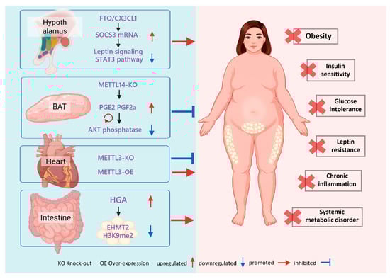 m6A-Mediated Systemic Regulation. m6A modification serves as a systemic bridge by controlling organ-specific secretomes. Hypothalamic FTO drives obesity through the SOCS3-STAT3 axis, whereas BAT-specific METTL14 deficiency improves insulin sensitivity by boosting prostaglandin secretion. In the heart, METTL3 levels positively correlate with diet-induced metabolic disturbances. Additionally, gut-derived HGA signals to white adipose tissue to induce metabolic dysregulation via m6A modulation.