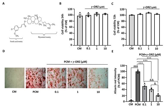 Effect of γ-oryzanol (γ-ORZ) on phosphate-induced calcification in VICs. (A) Molecular structure of γ-ORZ. (B,C) Cell viability of VICs treated with different concentrations of γ-ORZ (0.1, 1, 10 μM) for 24 h (B) and 72 h (C), determined by the MTS (3-(4,5-dimethylthiazol-2-yl)-5-(3-carboxymethoxyphenyl)-2-(4-sulfophenyl)-2H-tetrazolium) assay. Results are expressed as the mean ± standard error of the mean (SEM) (n = 3). (D) Representative images of Alizarin Red S staining showing calcium deposition in VICs cultured under control media (CM), pro-calcifying media (PCM), or PCM supplemented with γ-ORZ (0.1, 1, 10 μM) for 7 days. Red staining indicates calcium deposition (Original magnification: 100×). (E) Relative quantification of Alizarin Red S staining intensity by cetylpyridinium chloride assay. Results are expressed as the mean ± SEM (n = 3). ### p < 0.001 vs. CM; *** p < 0.001 vs. PCM; & p < 0.05 and && p < 0.01 between γ-ORZ treatment groups (0.1, 1, and 10 μM).
