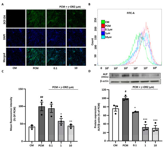 PCM is known to elevate intracellular ROS, which facilitates calcification by promoting oxidative stress [28]. Moreover, elevated ROS levels are often associated with increased alkaline phosphatase (ALP) expression, thereby promoting vascular calcification [29]. ROS levels were assessed using the fluorescent probe DCF-DA for qualitative (confocal microscopy) and quantitative (flow cytometry) analysis to evaluate the effect of γ-ORZ on PCM-induced ROS production. VICs treated with PCM exhibit increased green fluorescence compared to control cells, indicating elevated intracellular ROS; nuclei were counterstained with DAPI (blue) Figure 3A. Subsequently, treatment with γ-ORZ at both the lower and higher doses (0.1 and 1 μM) resulted in a prominent reduction in DCF-DA fluorescence intensity (3A). Correspondingly, flow cytometry assessment indicated a significant reduction in ROS levels, consistent with the microscopic image analysis (Figure 3B,C). Additionally, Western blot analysis (Figure 3D) showed a significant dose-dependent reduction in ALP protein expression in VICs with γ-ORZ treatment. Taken together, these results suggest that γ-ORZ inhibits calcification in VICs, at least in part, by mitigating oxidative stress and reducing oxidative stress mediated downstream proteins such as ALP.