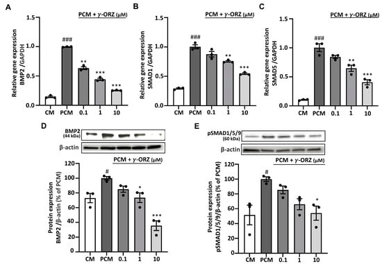 BMP-2 is mainly known for its involvement in ossification-like processes, which resembles the osteoblastic differentiation of VICs during calcification and acts as a crucial mediator in AVS progression [30]. In addition, ROS play a critical role in BMP-2 signaling necessary for early osteoblast differentiation [31]. Moreover, canonical BMP2 signaling is mediated by the phosphorylation of SMAD proteins such as SMAD1, SMAD5, and SMAD9, early markers of the pro-calcific signaling cascade [32]. Thus, to evaluate the role of γ-ORZ in PCM-induced BMP2 signaling during VIC calcification, SMAD1, SMAD5 and BMP2 gene expression were assessed. Furthermore, BMP2 and pSMAD1/5/9 protein levels were measured after 7 days of treatment with PCM, with or without γ-ORZ (0.1, 1, and 10 µM). The results showed that in PCM-treated VICs, gene expression of BMP2, SMAD1 and SMAD5 (Figure 4A–C) and protein levels of BMP2 and pSMAD1/5/9 (Figure 4D,E) were significantly increased compared to the control media. Concurrently, γ-ORZ treatment led to a dose dependent reduction in BMP-2, SMAD1 and SMAD5 mRNA levels, as well as in the protein expression of BMP-2 and pSMAD1/5/9 (Figure 4). Cumulatively, these findings suggest that γ-ORZ inhibits the canonical BMP-2/SMAD signaling pathway and may attenuate the early progression of calcification in VICs.