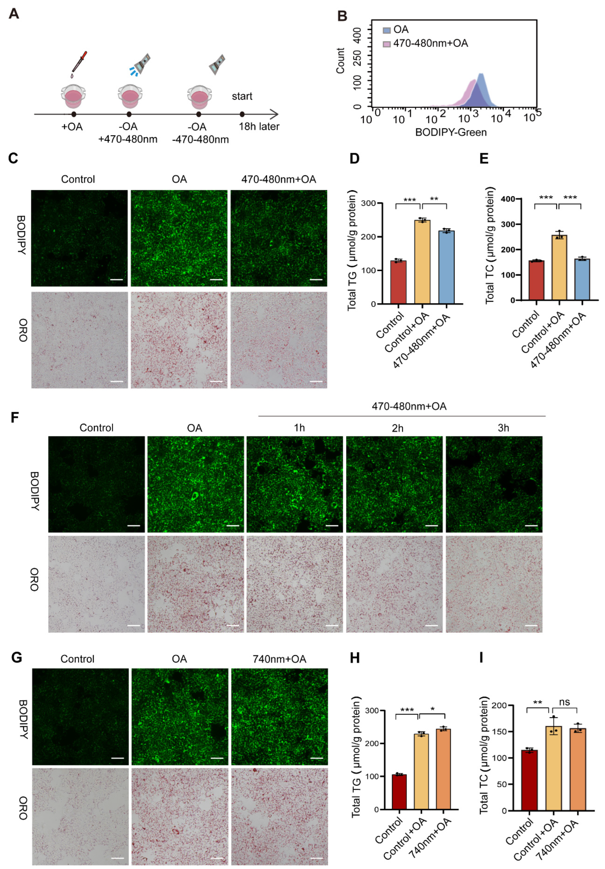 After treating the cells with OA and light exposure, wash them twice with PBS, then fix them with 4% paraformaldehyde for 20 min, and wash them twice again with PBS to remove the excess paraformaldehyde. Subsequently, each well was treated with 60% isopropyl alcohol for 5 min and then discarded. Add the filtered oil red O working solution to the cells and stain them in the dark for 30 min, then wash them twice with distilled water. Finally, images were captured using an inverted microscope.