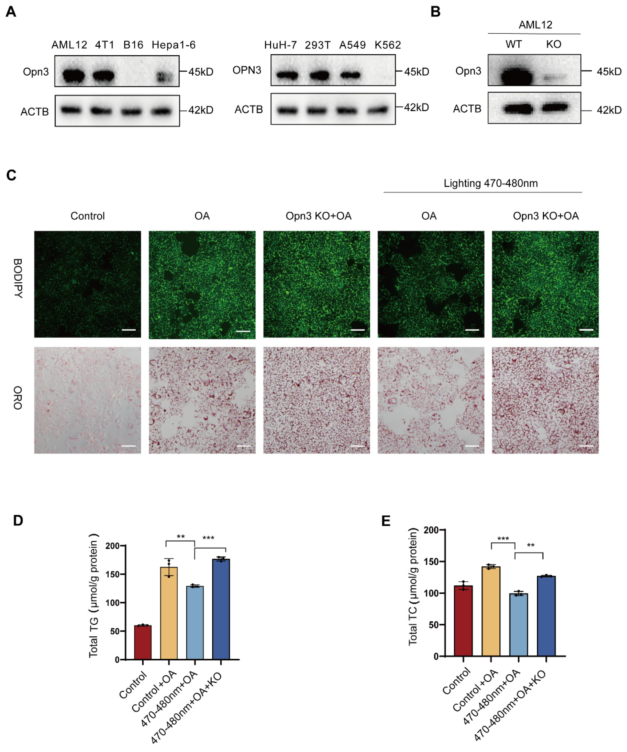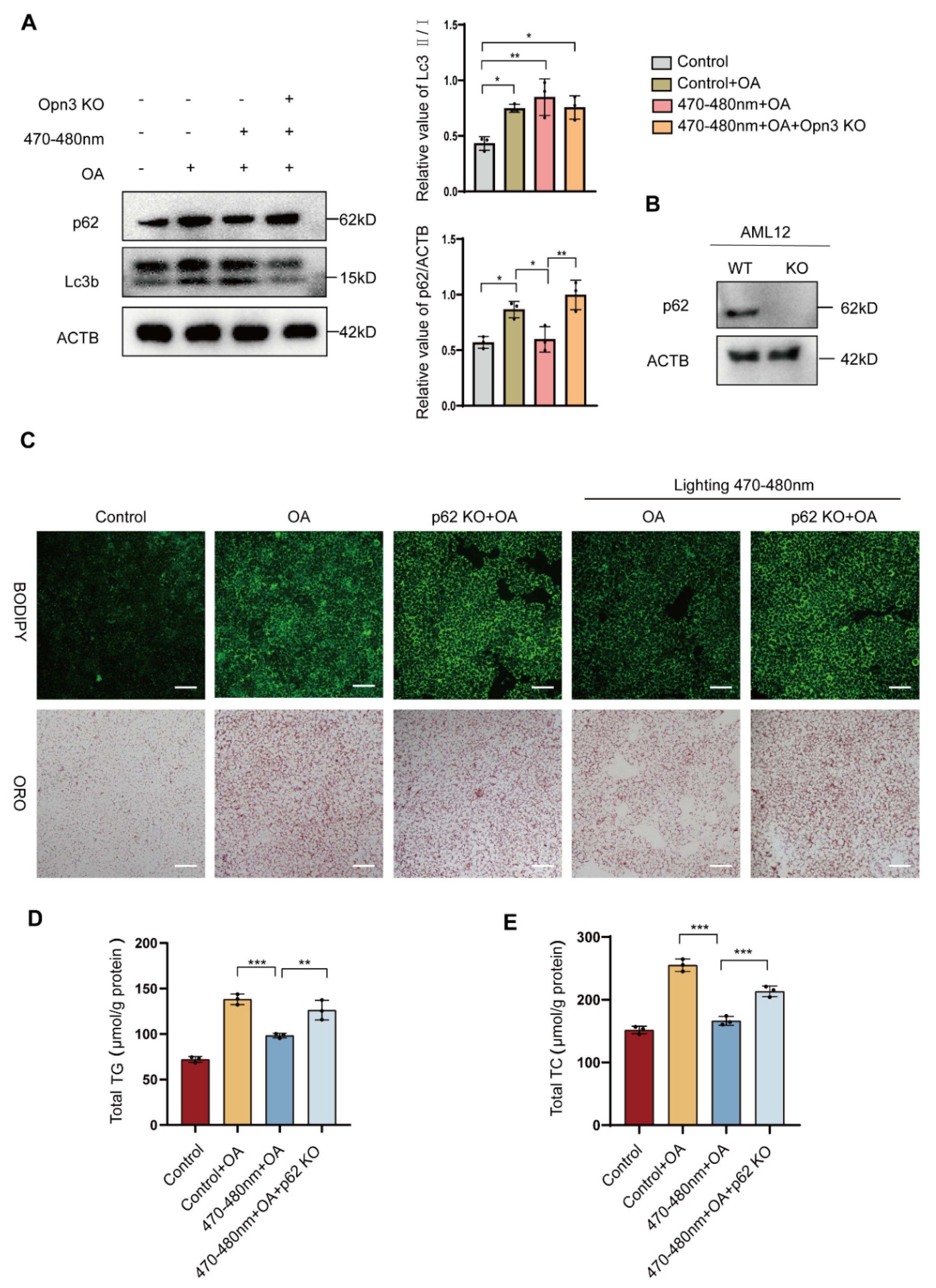However, the mechanism by which blue light and Opn3 regulate lipolysis remains poorly understood. It is unclear whether they participate in lipid droplet degradation and how their action relates to classical lipid metabolic pathways. Using AML12 mouse hepatocytes, this study examined the impact of 470–480 nm blue light on the degradation of lipid droplets that had been accumulated through oleic acid (OA) treatment. Blue light exposure significantly reduced lipid droplet content and decreased triglyceride (TG) and total cholesterol (TC) levels in an Opn3-dependent manner. Opn3 KO cells confirmed that Opn3 is required for blue light-induced lipid droplet degradation. Furthermore, we identified critical roles for Pparα and p62 in this pathway: Pparα KO markedly inhibited blue light-mediated lipid droplet degradation, while p62 deletion blocked both Lc3b conversion and lipid droplet clearance. Given the significant impact of lipids on viral infection [