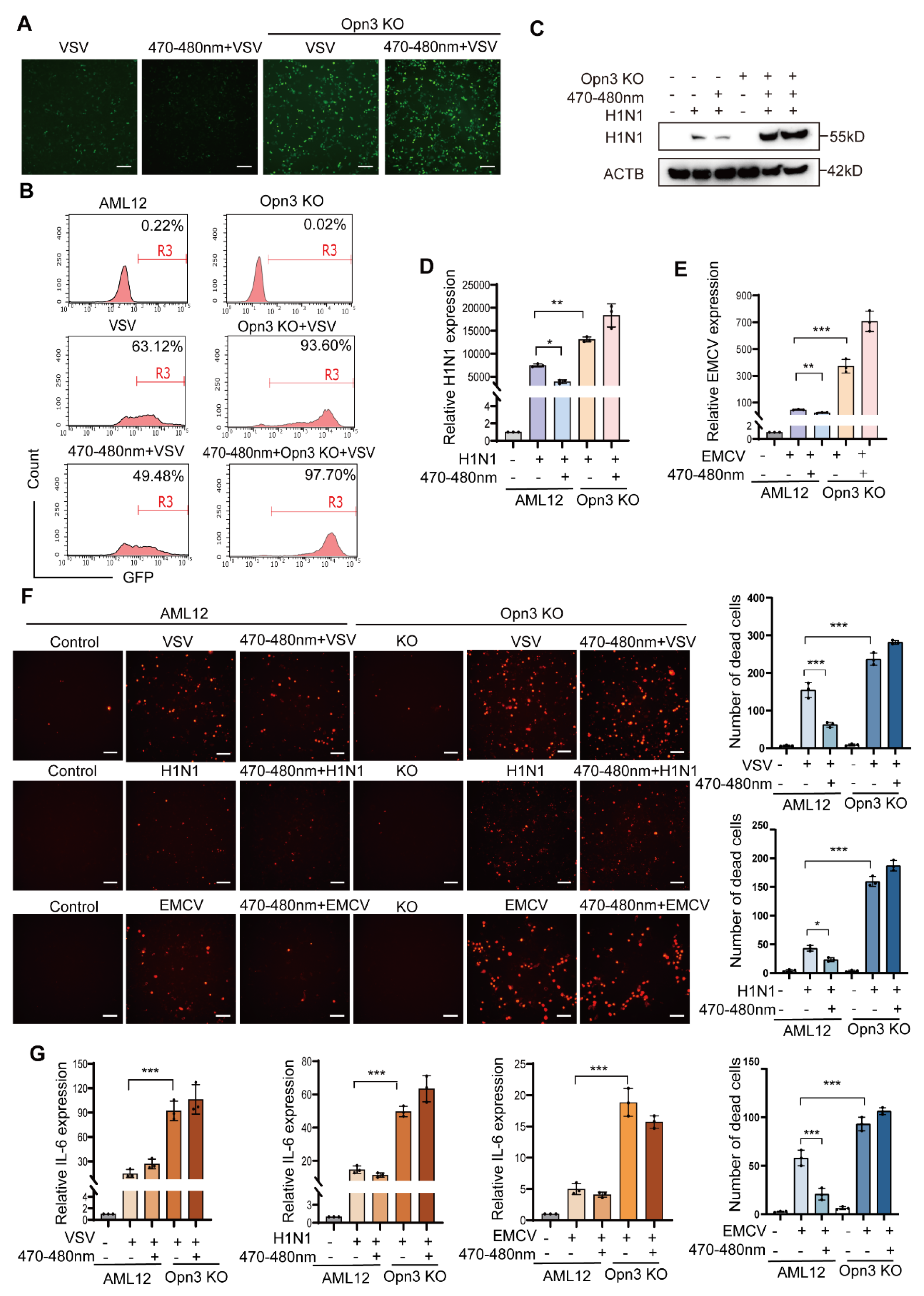 Vesicular stomatitis virus labeled with enhanced green fluorescent protein (VSV-GFP), EMCV, human influenza virus A/Puerto Rico/8/34 (H1N1) (PR8) were stored from our laboratory. Cells were seeded in culture plates and allowed to reach 60–70% confluence prior to experimentation. Wild-type AML12 cells were infected with diluted viral suspensions at the following multiplicities of infection: GFP-VSV (1:500), EMCV (1:10,000), and H1N1 (1:10,000). Similarly, Opn3-knockout AML12 cells were infected with VSV (1:500), EMCV (1:10,000), and H1N1 (1:10,000). After 6 h of incubation in a cell culture incubator, the cells were exposed to 470–480 nm blue light for 3 h, followed by an additional 4 h of culture before subsequent analyses were performed.