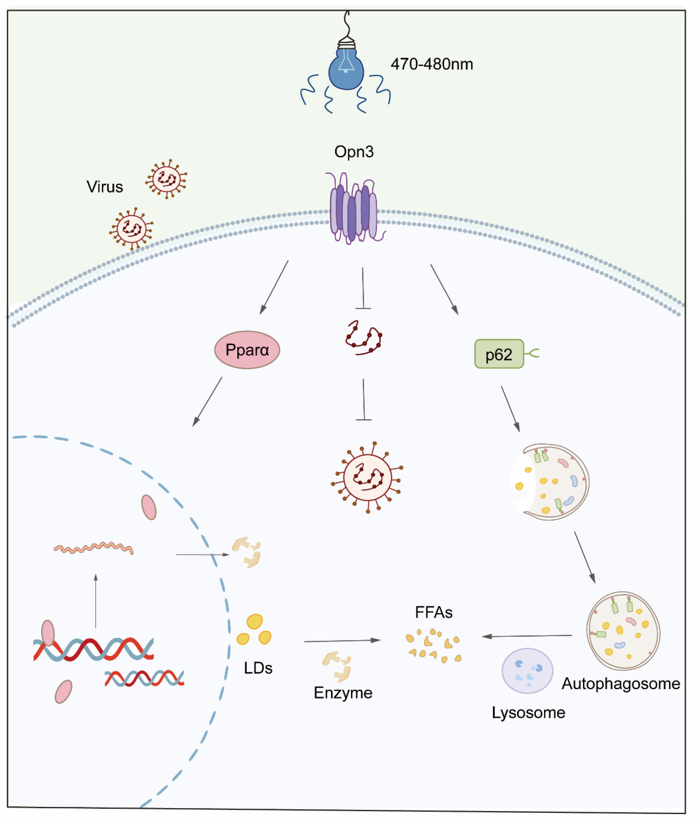 These results indicate that blue light promotes lipid droplet degradation through the Opn3- Pparα signaling axis, with the autophagy protein p62 playing an essential role. Additionally, Blue light combined with Opn3 reduces viral replication. This study advances our understanding of the relationship between light exposure and lipid droplet metabolism, offering new perspectives for treating related metabolic disorders and providing a foundation for antiviral research.