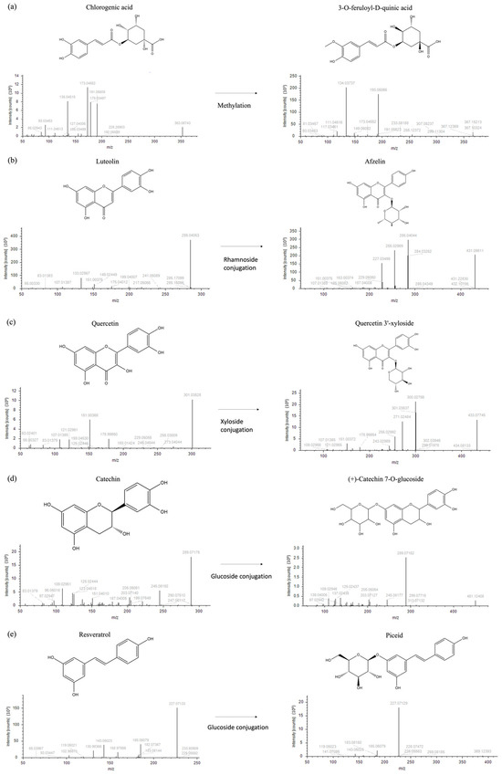 Figure 2. Fragmentation spectra and biochemical transformation of different compounds. (a) Methylation of chlorogenic acid to form 3-O-feruloyl-D-quinic acid; (b) conjugation of rhamnoside and luteolin to obtain afzelin; (c) conjugation of xyloside and quercetin to form quercetin 3′-xyloside; (d) conjugation of glucoside and catechin to obtain catechin 7-O-glucoside; (e) conjugation of glucoside and resveratrol to form piceid; (f) conjugation of glucoside and aesculetin to obtain aesculin; (g) oxidation and methylation of coumaroyl aesculin to form feruloyl aesculin; (h) oxidation of ursolic acid to obtain corosolic acid; and (i) procyanidin B type formation upon reduction of procyanidin A.