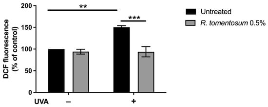 Figure 5. Antioxidant activity of R. tomentosum hydroalcoholic extract determined by DCFDA assay. HaCaT cells were incubated in the presence of 0.5% (v/v) of the extract for 2 h, stressed with a UVA lamp (100 J/cm2), and intracellular ROS level was measured. ROS production was expressed as a percentage of the intensity of DCF fluorescence compared to untreated cells. Black bars refer to control cells, and gray bars refer to cells incubated with the extract, in the absence (−) or presence (+) of UVA stress. Data shown are mean values ± S.D. of three independent experiments. ** indicates p < 0.01, and *** indicates p < 0.001. The lines above the bars indicate the two samples compared for statistical analysis.