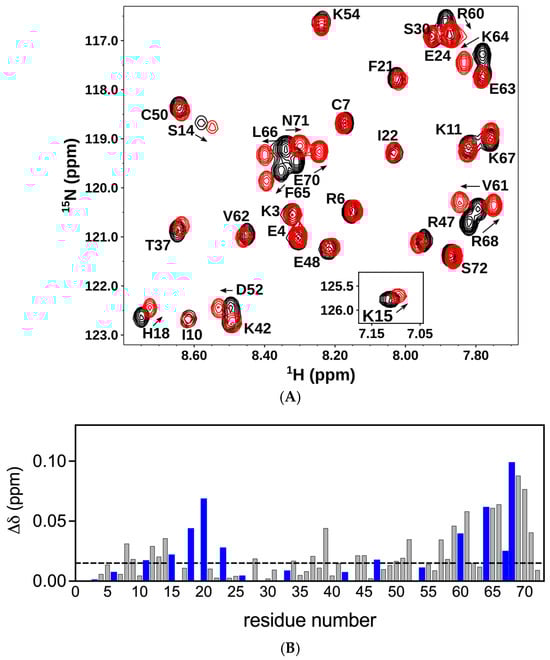 Binding of CXCL8 monomer to chondroitin sulfate. (A) Sections of the 1H-15N HSQC spectra showing the overlay of the CXCL8 monomer in the free (black) and CS dp14 bound (red) forms. Arrows indicate the direction of the peak movement. (B) Histogram plot of chemical shift changes in CXCL8 monomer on binding to CS dp14. Residues showing CSP higher than the threshold (indicated by the dotted line) are implicated in binding. Basic residues lysine, arginine, and histidine are shown in blue.