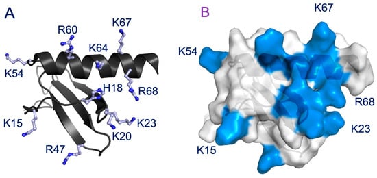 Distribution of basic residues that mediate GAG interactions. (A) A schematic of CXCL8 monomer showing the distribution of basic residues Arg, Lys, and His in ball and stick. (B) Surface plot of CXCL8 monomer with the GAG-binding residues shown in blue. Residues that are unique to CXCL8 are labeled.