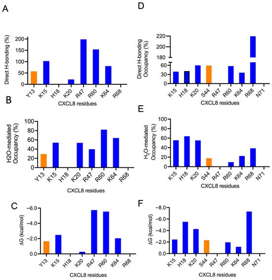 H-bonding properties and energetics of the interface residues of the CS–dimer complexes. Plots for CS4S and CS6S binding to one of the monomers of the dimer are shown in the left and right columns, respectively. (A,D) Occupancy of intermolecular H-bonds; (B,E) occupancy of water-mediated H-bonds; and (C,F) single-residue energy-decomposition values. Basic and polar residues are shown in blue and orange, respectively.