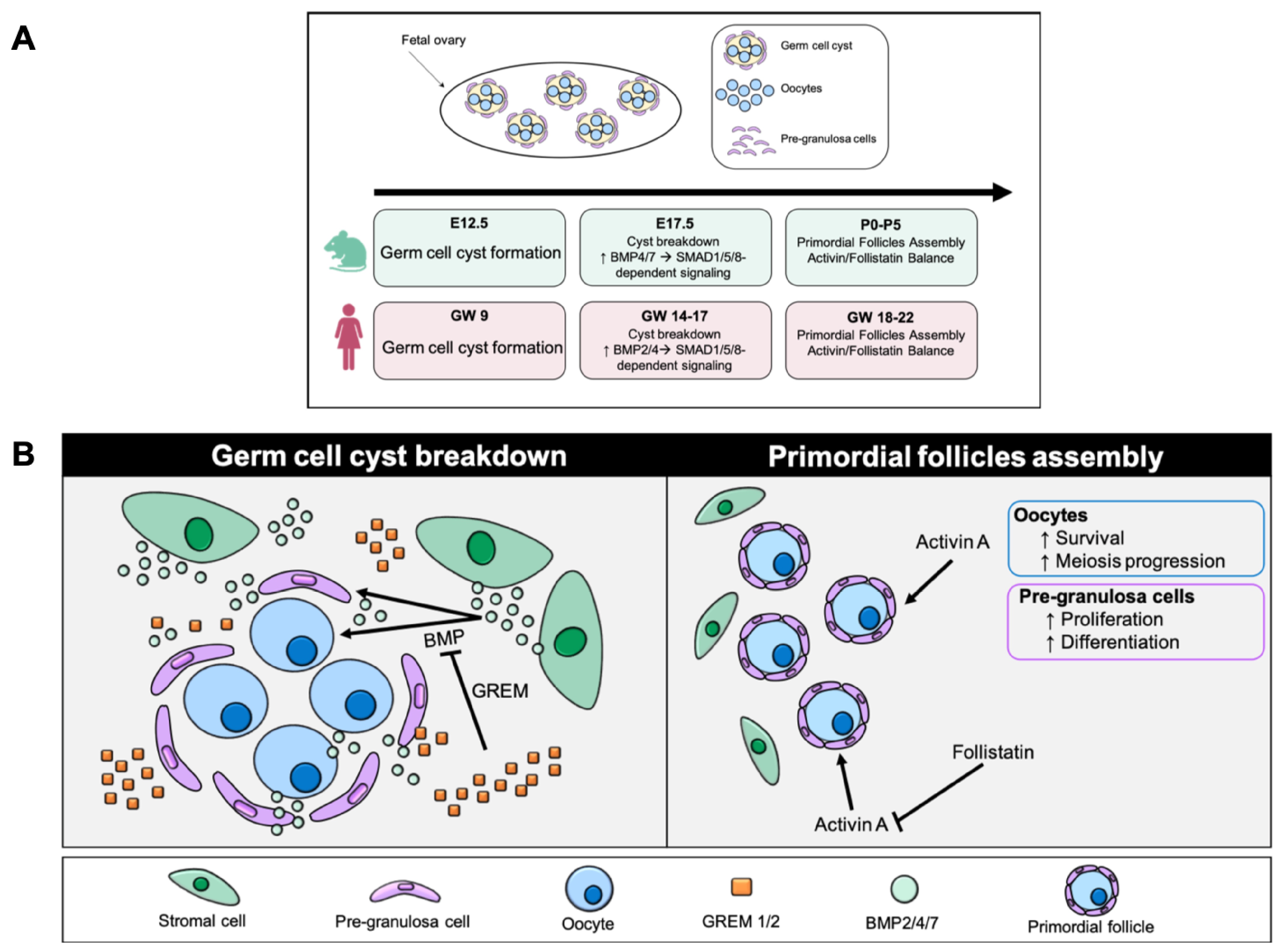 Figure 1. TGF-β in fetal ovary development. (A) Comparative timeline of TGF-β family signaling during fetal ovary development in mouse and human. This diagram shows the main stages in the formation of germ cyst, their breakdown and the assembly of primordial follicles in two species. In mice (E12.5–P5) and humans (GW 9–22), germ cell cyst breakdown is associated with increased BMP2/4/7–SMAD1/5/8/4 activity, while follicular assembly depends on the balance between activin A and follistatin (E = embryonic day in mice; P = postnatal day in mice; GW = gestational week in humans). (B) The left panel illustrates the phase of germ cell cyst breakdown, during which oocytes initially organized in interconnected cysts become progressively individualized. BMP signals (primarily BMP2/4/7), produced by the ovarian stroma, promote cyst dissociation and oocyte individualization, facilitating the transition toward primordial follicle formation. GREM antagonists (GREM1/2) restrict BMP activity by modulating the magnitude and spatial distribution of the signal, thereby preventing premature or excessive follicular activation. The right panel illustrates primordial follicle assembly, a stage in which each oocyte is surrounded by pre-granulosa cells. Activin A supports oocyte survival, promotes meiotic progression, and stimulates proliferation and differentiation of pre-granulosa cells, ensuring proper initiation of folliculogenesis. Follistatin, an antagonist of activin A, modulates its activity to maintain the balance between somatic cell proliferation and follicle maturation. The activin–follistatin axis thus ensures the structural and functional formation of primordial follicles.