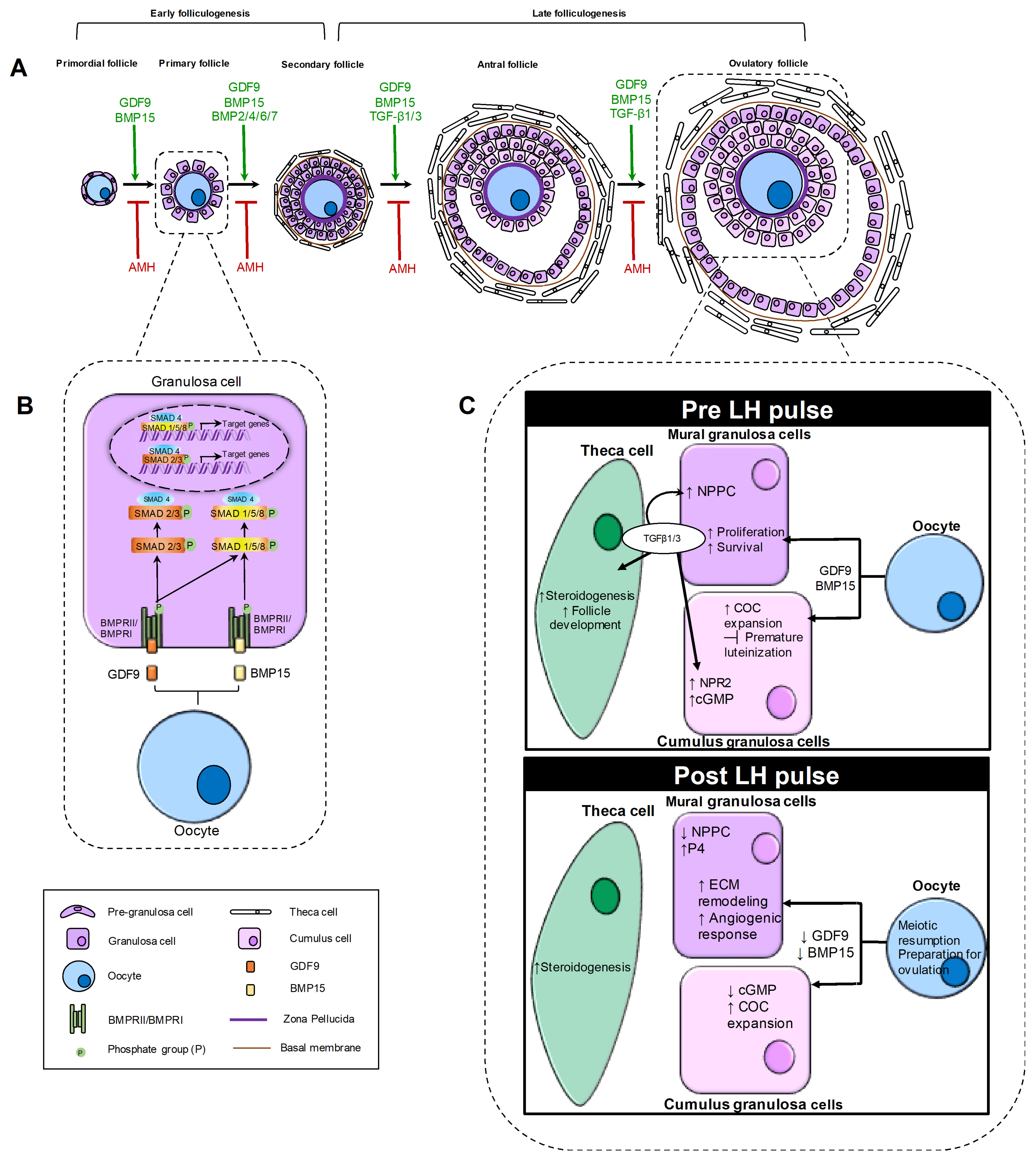 Figure 2. Schematic representation of the role of TGF-β family in ovarian folliculogenesis. The figure illustrates the dynamic role of TGF-β superfamily members throughout the progression of ovarian follicles from the primordial to the ovulatory stage. (A) Follicular progression and key TGF-β ligands involved. The figure illustrates the sequential stages of folliculogenesis, showing the progression of ovarian follicles from the primordial to the ovulatory stage. For each stage, it highlights the TGF-β family members that promote follicular growth (shown in green), as well as the inhibitory factors (shown in red) that act during both early and late folliculogenesis. (B) TGF-β signaling pathway in early folliculogenesis. The binding of GDF9 and BMP15 ligands produced by the oocyte to type I and II receptors expressed on the GC membrane induces the phosphorylation of specific R-SMADs (SMAD1/5/8 and SMAD2/3). The phosphorylated R-SMADs form a complex with SMAD4 and translocate to the nucleus to activate or repress genes involved in granulosa cell differentiation and proliferation. (C) TGF-β signaling pathway in late folliculogenesis. The panels compare TGF-β signaling activity in mural granulosa and cumulus cells under pre-LH and post-LH pulses. In the pre-LH pulse condition, the oocyte produces GDF9 and BMP15, acting on both mural granulosa and cumulus cells. In mural granulosa cells, they promote proliferation and survival, while in cumulus cells they support COC expansion and inhibit premature luteinization. Mural granulosa cells also produce TGF-β1/3, which act autocrinely to increase NPPC and paracrinely on cumulus cells to upregulate NPR2 and cGMP. In theca cells, TGF-β1/3 enhances steroidogenesis. In the post-LH pulse condition, oocyte production of GDF9 and BMP15 decreases. In mural granulosa cells, this reduction is associated with extracellular matrix (ECM) remodeling, increased angiogenesis and decreased NPPC production, as well as increased progesterone (P4) levels. The decline in GDF9 and BMP15 also reduces cGMP levels, which stimulates meiotic resumption in the oocyte. In theca cells, steroidogenesis is promoted during this phase.