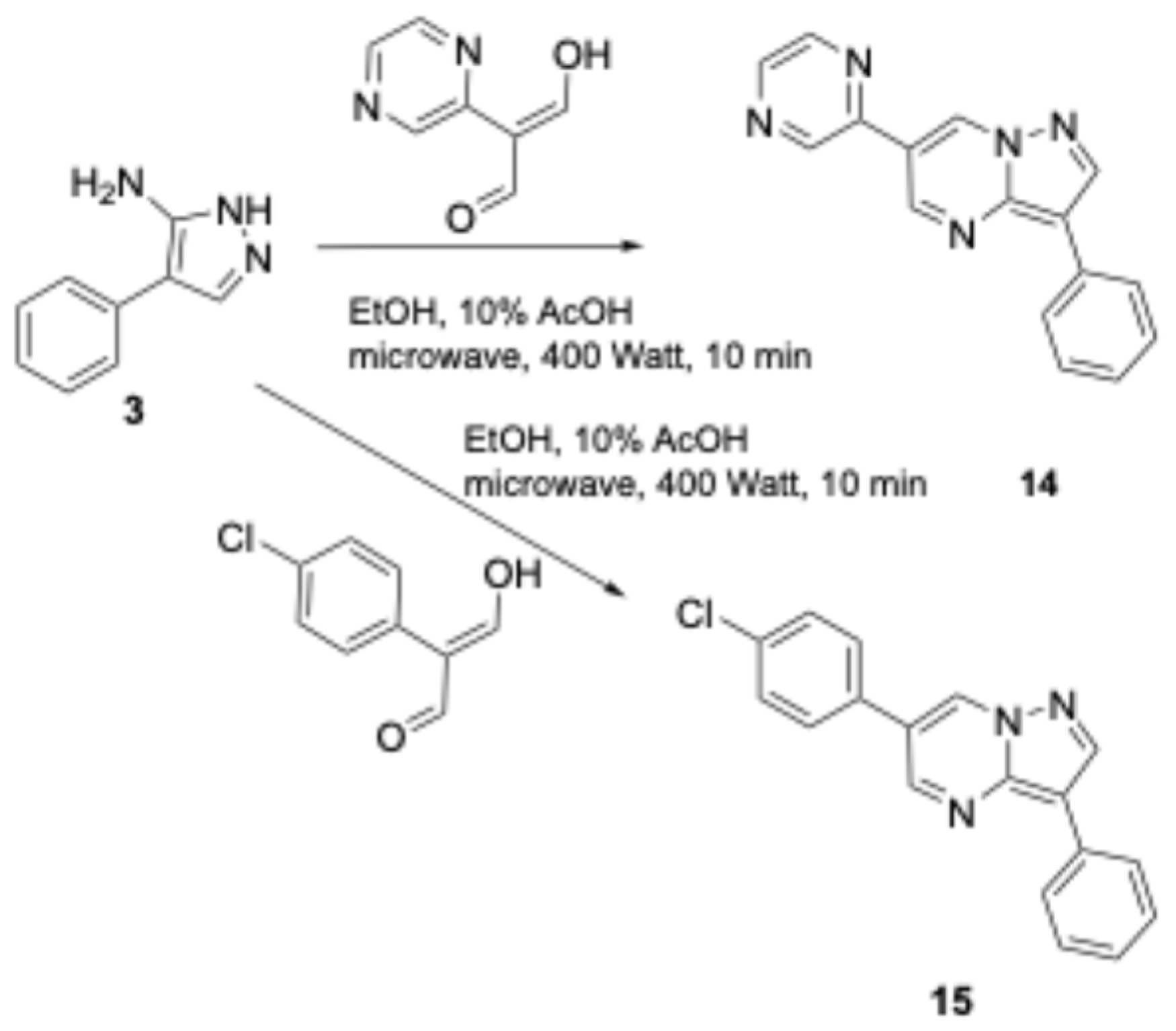 - Daniels, R.N.; Kim, K.; Lebois, E.P.; Muchalski, H.; Hughes, M.; Lindsley, C.W. Microwave-assisted protocols for the expedited synthesis of pyrazolo[1,5-a] and [3,4-d]pyrimidines. Tetrahedron Lett. 2008, 49, 305–310. [Google Scholar] [CrossRef]