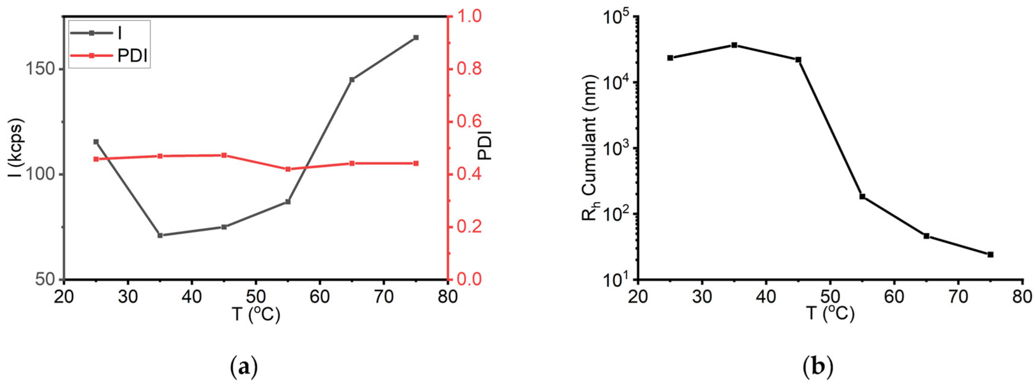 Figure S12a, the scattering intensity increased by 9-fold while the temperature increased from 25 to 55 °C. At this temperature, the solution became opaque, as shown in