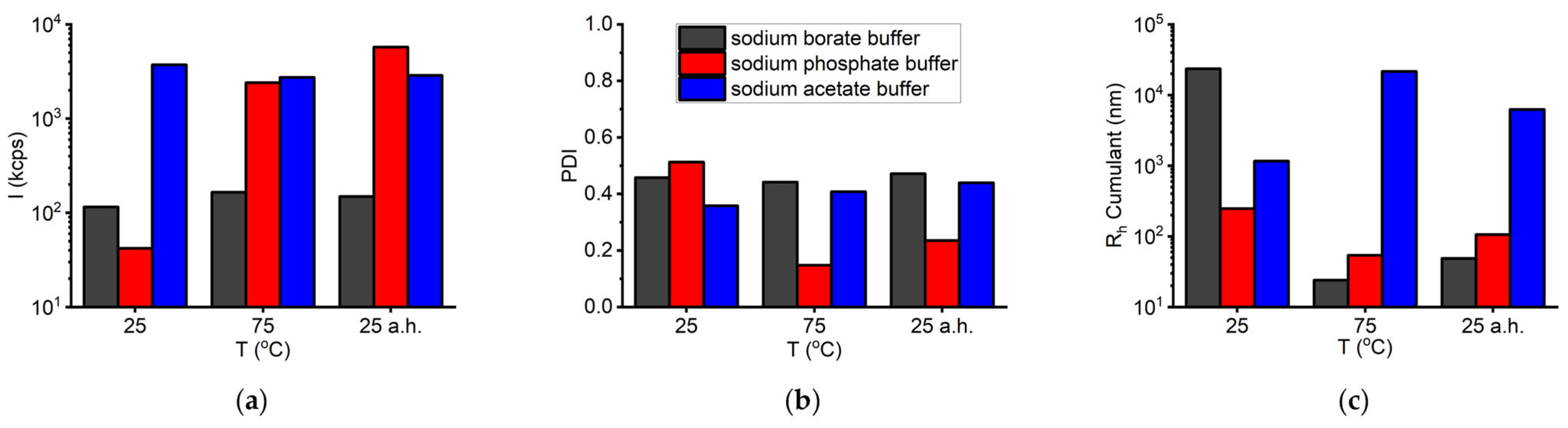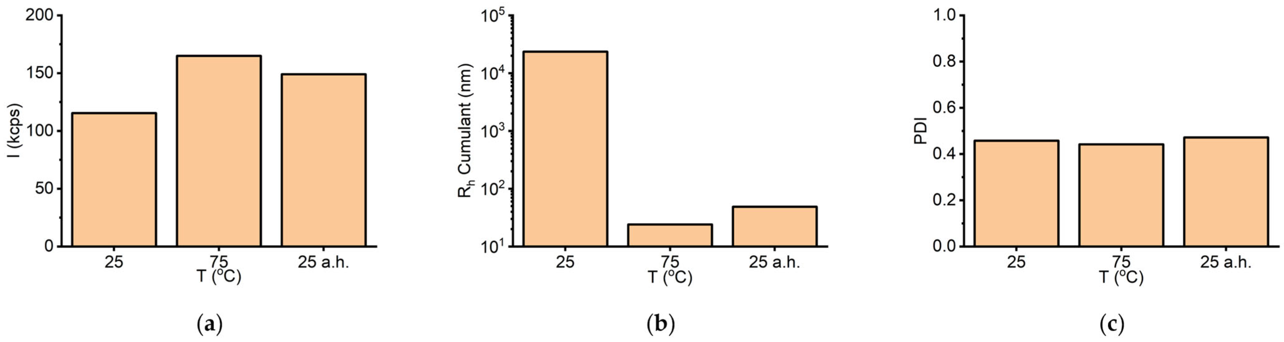 To further investigate the effect of heat on protein aggregation, DLS measurements were performed at 25 °C (b.h.), at 75 °C, and again at 25 °C after the sample was allowed to cool (a.h.) (