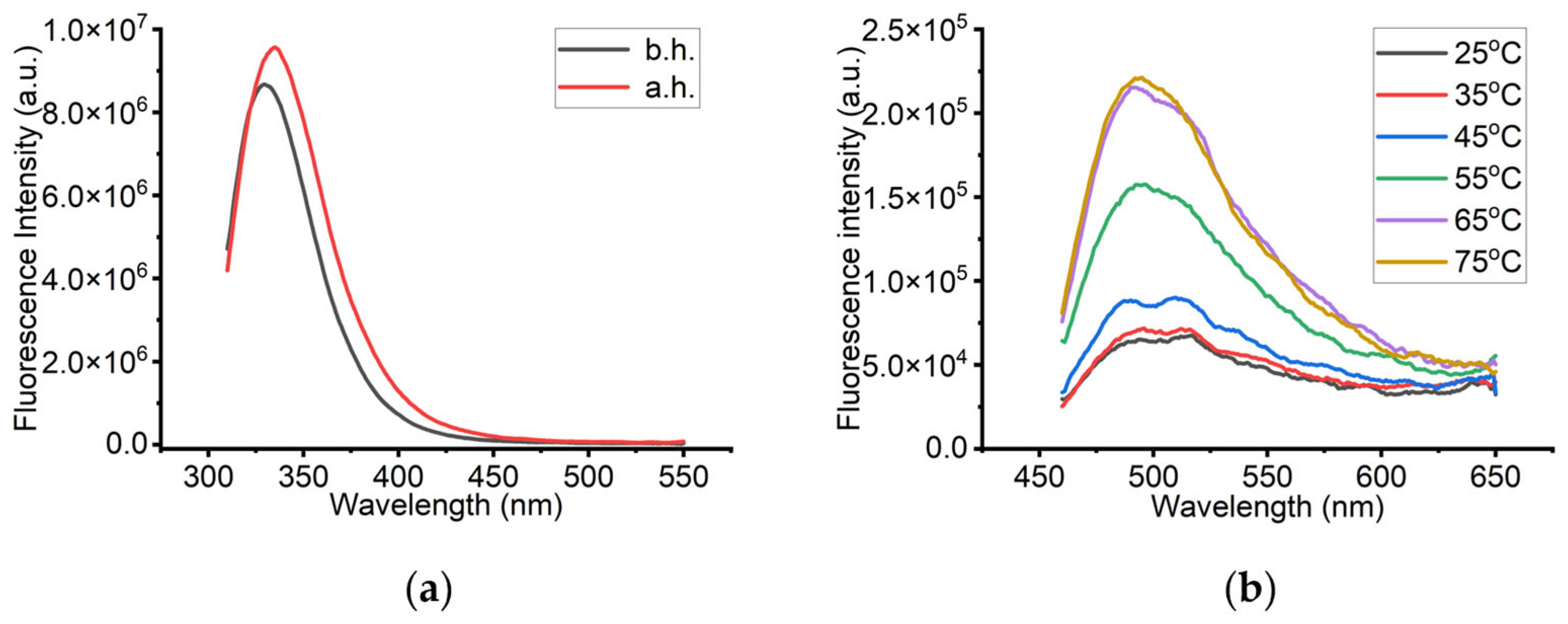 Figure S15a, the intensity maximum was located at 328 nm at 25 °C and was shifted to 332 nm after heating at 75 °C. This represents a 4 nm difference compared to the values observed in sodium borate and sodium acetate buffers. In addition, the fluorescence intensity decreased by 13% before and after heating. By comparing these results with those from the other two buffers (see
