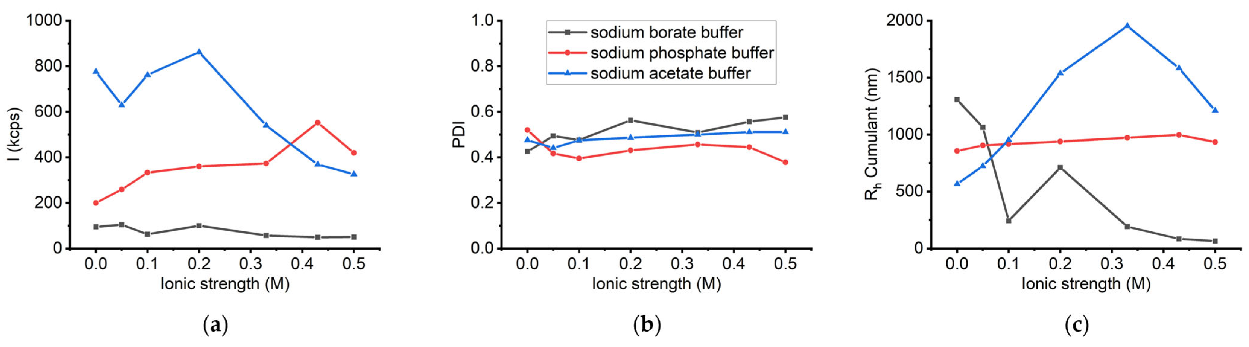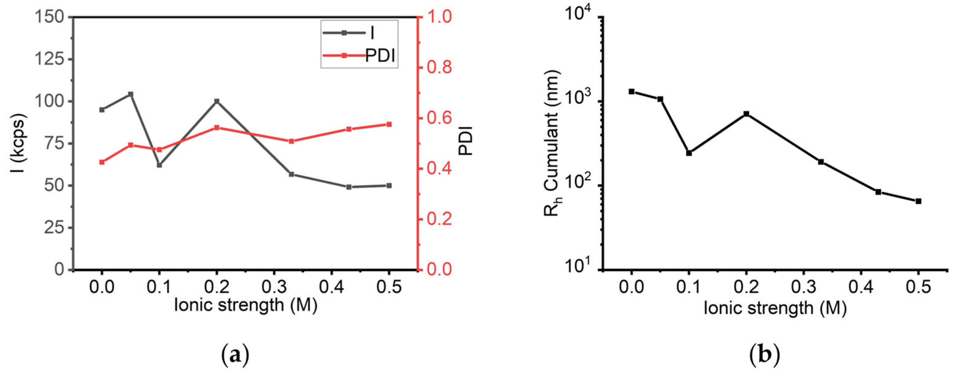 Figure 9a). As the sodium chloride concentration increased, a slight deviation of the intensity was observed, reaching 50 kcps at 0.5 M. The PDI values ranged from 0.4 to 0.6 across the tested salt concentrations, indicating moderate sample heterogeneity (