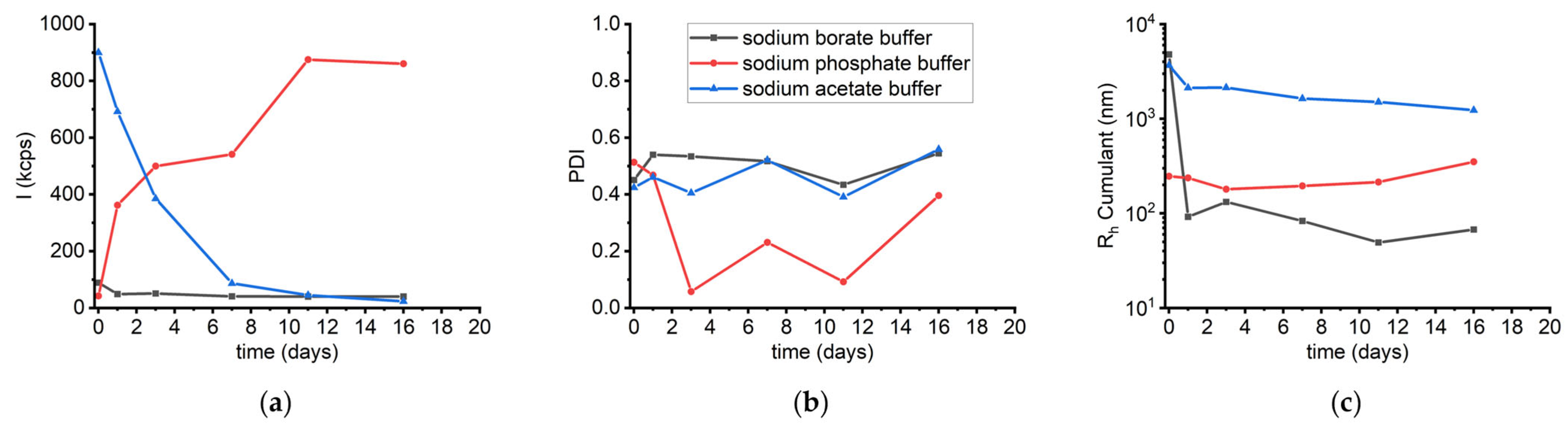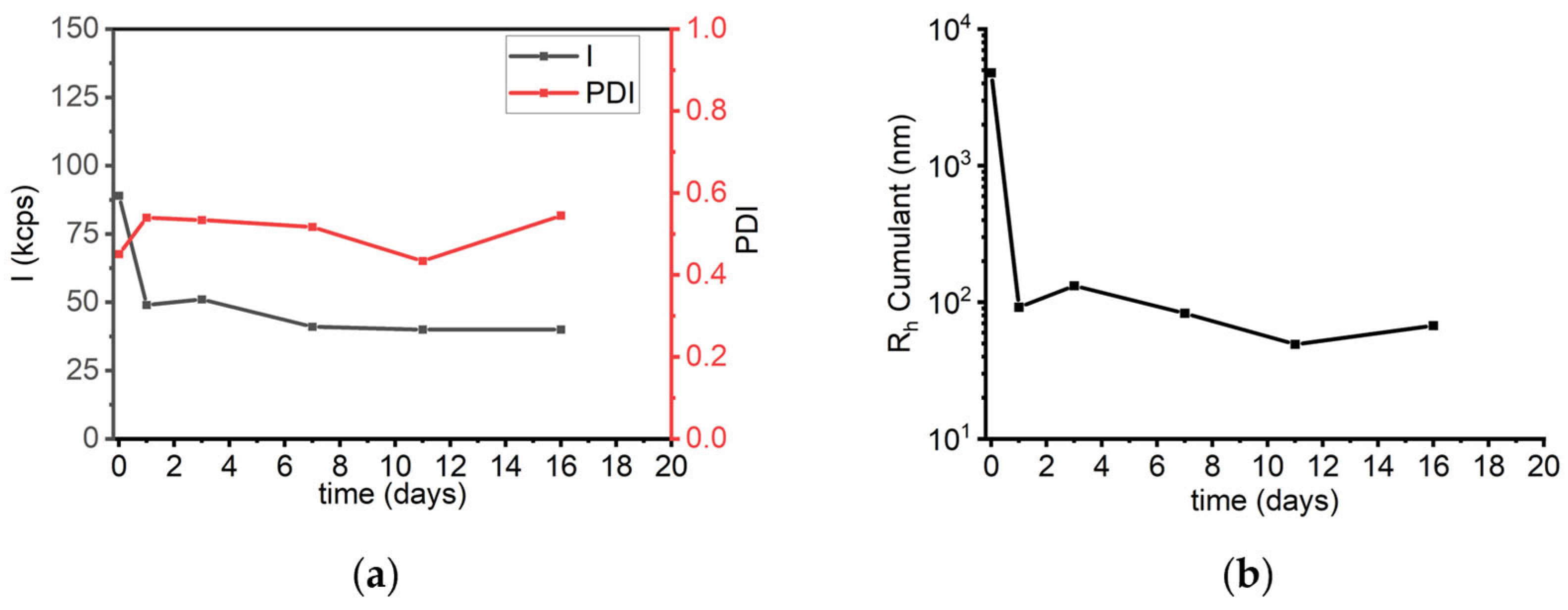 Figure 10a). Throughout the time course, PDI values remained in the range of 0.4 to 0.6, indicating no significant changes in the polydispersity of the solution (